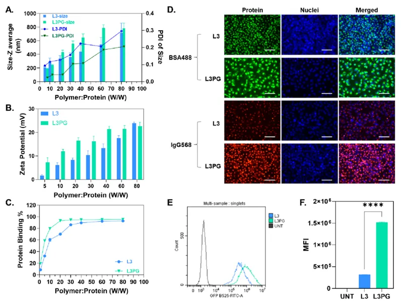 首先,作者以牛血清白蛋白(BSA,66 kDa,pI 4.6)作为模型蛋白研究了PAEs的蛋白结合能力。动态光散射(DLS)结果显示,当聚合物与蛋白质量比在5~80之间,L3PG和L3都能与BSA组装形成纳米粒,并且随着质量比增加,纳米粒尺寸也会增大。相比于L3,L3PG表现出更加优异的蛋白结合能力,约95%的蛋白在质量比为20时即可被封装,虽然L3也能达到类似的蛋白封装效率,但质量比却必须增加到30以上。这些结果表明PG修饰有助于提高载体的蛋白结合能力。