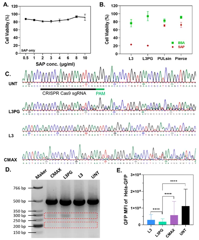 为了进一步证明PAEs是一种通用型蛋白质递送载体,作者将PAEs用于CRISPR/Cas9核糖核蛋白(RNP)的递送,并进一步实现基因编辑。作者在GFP表达的HeLa细胞系(HeLa-GFP)中设计了一段用于GFP基因敲除的引导RNA(sgRNA),并通过电穿孔法进行了验证。Sanger测序结果显示电穿孔法介导下约80%的靶点都被敲除,经过L3PG/RNP复合物和L3/RNP复合物转染细胞分别能够实现19%和6%的靶点敲除,而商业化CRISPR/Cas9 RNP递送试剂脂质体(CMAX)则实现了20%的靶点被敲除。T7内切酶I(T7E1)法的实验结果进一步证实了上述目标基因编辑情况。与L3PG组相比,L3组只参与了少数的基因编辑,这表明PG修饰不仅增强了PAEs与蛋白质之间的相互作用,而且还提高了RNP复合物中sgRNA的稳定性。通过检测处理后HeLa-GFP中的GFP表达水平,发现与未处理的HeLa-GFP细胞相比,L3PG组的GFP表达减少了83%,而L3组和CMAX组的GFP表达分别减少了73%和52%。虽然所有试剂处理的细胞都具有良好的细胞活力,但作者也观察到使用PAEs转染会导致细胞损伤和增殖,进而导致GFP可能在细胞分裂过程中丢失,造成相应细胞样品中观察到的荧光强度降低,这也解释了为什么CMAX组的基因编辑效率虽高于APEs组,但最后GFP表达的下调量反而低于APEs组。