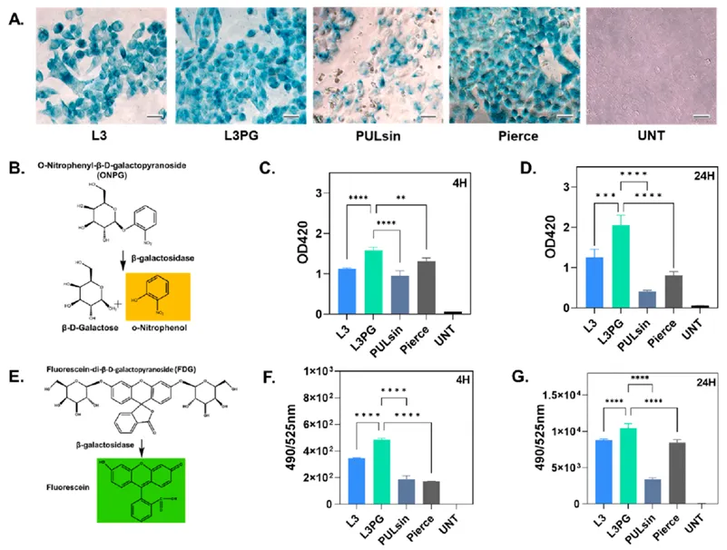 与核酸不同,蛋白质的生物活性可能会在与聚合物的结合或解离过程中被破坏,因此载体对蛋白功能的保护也很关键。这里,作者通过递送一种酶蛋白,即β-半乳糖苷酶(β-Gal)来研究PAEs对蛋白活性的保护能力,β-Gal是一种带负电荷的大蛋白(464 kDa,pI 4.6),可以催化多种β-半乳糖苷的水解。为了评价β-Gal的生物活性,作者以商业化蛋白转染试剂PULsinTM和PierceTM作为阳性对照,将无色的5-溴-4-氯-3-吲哚半乳糖苷(X-Gal)底物加入到被不同载体转染处理后的Hela细胞中,发现L3组、L3PG组和PierceTM组处理后的细胞被染成深蓝色,表明β-Gal在经过这三组处理后依旧能保持较强的生物活性,而PULsinTM组处理的细胞只被染成了微弱的蓝色,阴性组的细胞根本没有被染色。此外,作者还通过另外两种底物:邻硝基苯-β-半乳糖苷(ONPG)和荧光素脱脂酶(FDG),进一步证明了经两种PAEs组转染处理后的HeLa细胞中的β-Gal都能保持较好的生物活性,甚至远超过商业化蛋白转染试剂组的活性,并且PG修饰使PGL3具有更优越的蛋白活性保护能力。