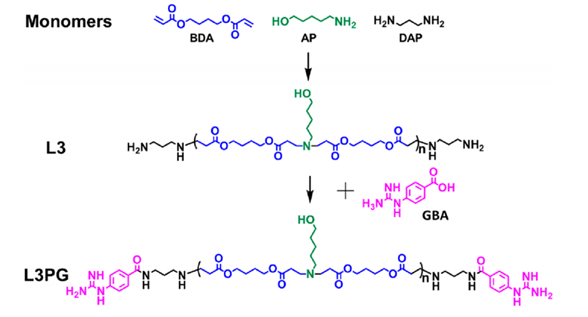 线性的聚β氨基酯(PAEs)可通过Michael加成聚合得到。这里,作者基于团队前期工作,使用了优化后的单体配方和聚合物分子量调控策略,得到了一种具有潜在递送蛋白质功能的聚β氨基酯结构(L3)。以L3为原料,与4-胍基苯甲酸(GBA)进一步反应,得到了苯胍基(PG)修饰的聚β氨基酯(L3PG)。
