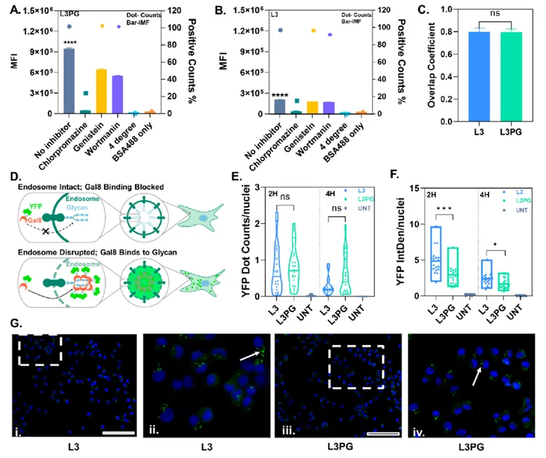 接着,作者比较了Hela细胞对两种PAEs/蛋白复合物的内吞差异,激光共聚焦和流式结果都显示L3PG/蛋白复合物具有更高的细胞摄取量。因此,可以证明L3PG在蛋白质内化方面更具优势。
